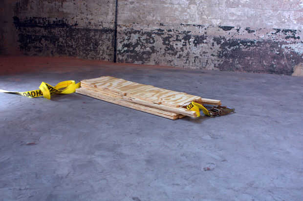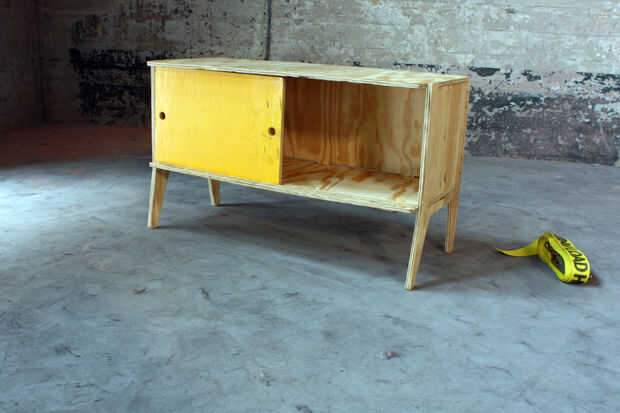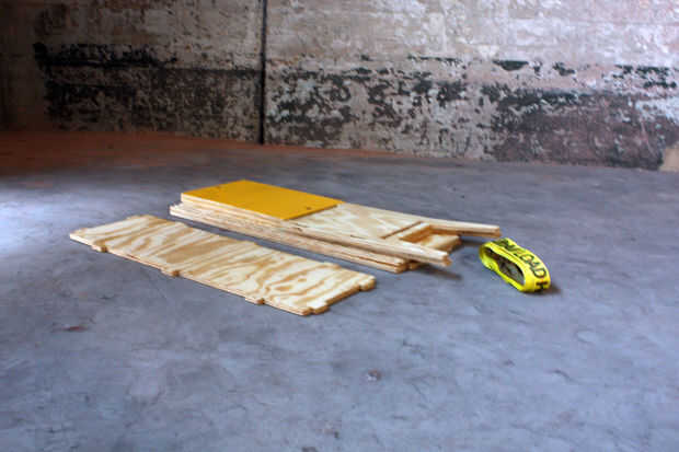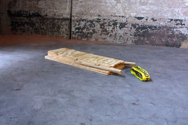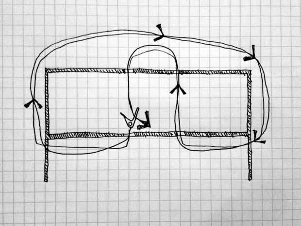 A partir de la correa de trinquete dentro del cuerpo de la caja, introducir el extremo libre hacia abajo a través de la ranura de la izquierda en la parte inferior. Tire de ella a través de la ranura que forma parte de la mortaja de la parte inferior de la pieza del lado izquierdo, luego por todo el mueble entero, a través de la mortaja de lado opuesto y en el cuerpo del gabinete. Llevarlo hacia arriba a través de la ranura de la derecha en la parte superior del mueble, más de 12" y a través de la ranura de la otra.