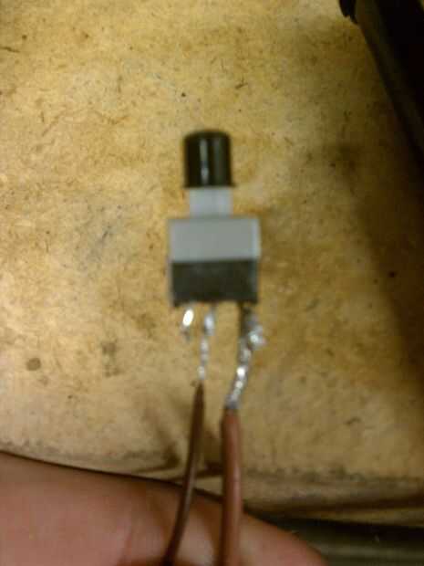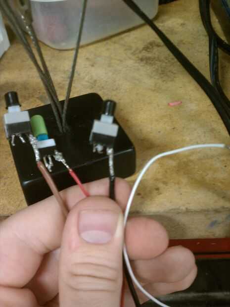 A continuación coge esos tres botones que tienes. Si tienes una de esas manos ayudantes, clip el botón a él. Debe haber tres cables pequeños de metal en la parte inferior del botón. Cuando el botón es presionado, conecta los dos cables de la derecha y cuando es hacia arriba, se conecta la izquierda dos. Así que nos vamos a conectar el cable del motor a la mitad y la batería a la derecha cuando se presiona hacia abajo, conecta la batería al motor y lo gira. Así que como he dicho, la soldadura de los conductores positivo del motor a la mitad de cada botón.