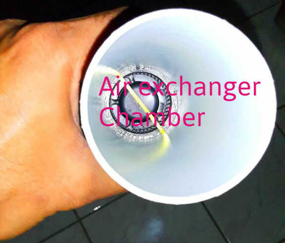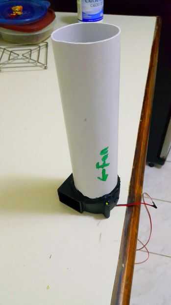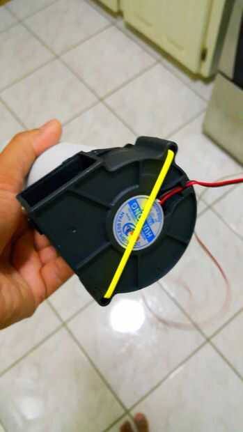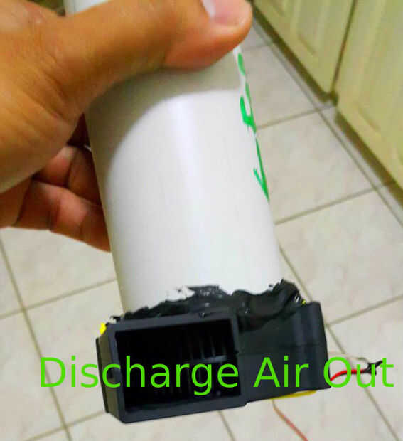 Utilizando un tubo de pvc de 2 pulgadas, aseguró un ventilador de 12 voltios a uno de los extremos con un lazo de cable largo. Tuve que perforar el tubo para hacer esto. Pongo evostik seguido de adhesivo de silicona (los héroes anónimos 2) para sellar alrededor del ventilador y el tubo.