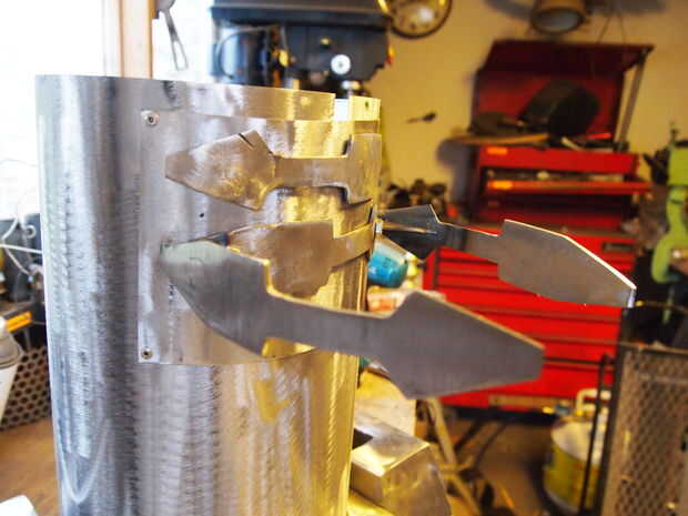 Los dos primeros fueron doblados para ajustar la curva del cuerpo, no es una fácil cosita hacerlo con acero esta grueso, pero manejable. Taladre un agujero en cada extremo de estas dos galones y luego manténgalo contra el cuerpo donde usted quiere que vaya. Marque los orificios en el cuerpo y perfore. Más tarde estos se utilizarán para empernar la tolva de la planta de chevron y café en el pecho. "El galón superior realmente alimenta los tornillos por los agujeros, lijados las cabezas nada y soldada en su lugar. Esto se ve muy bien pero es complicado conseguir detrás en el cuerpo debido a la curva!