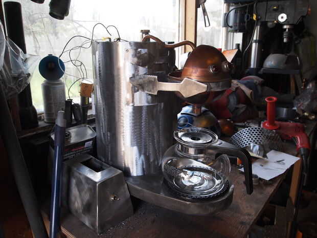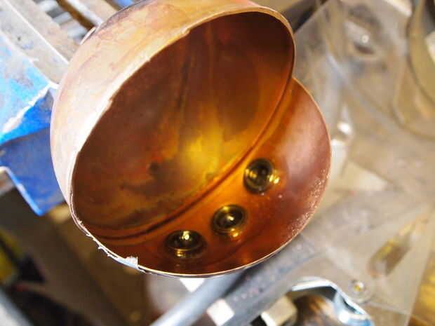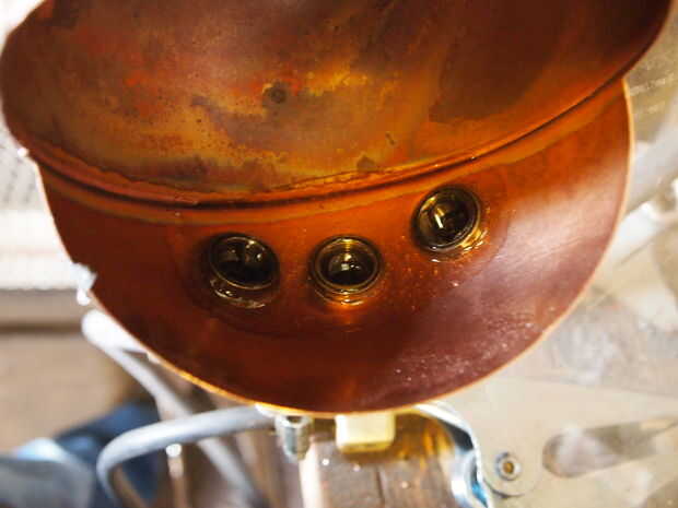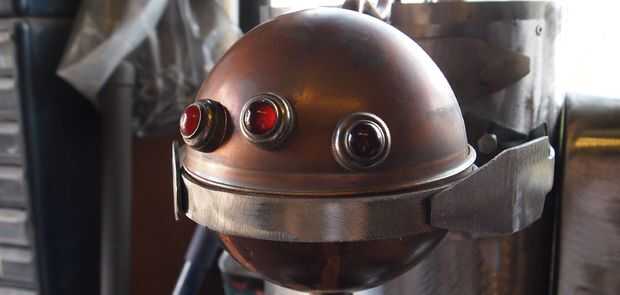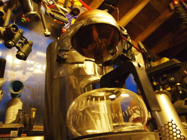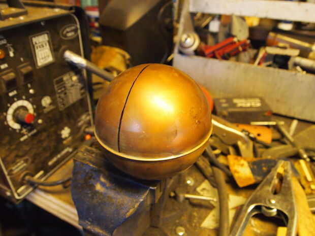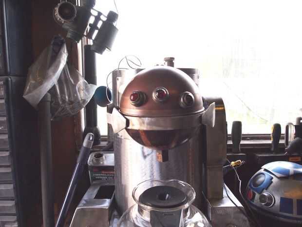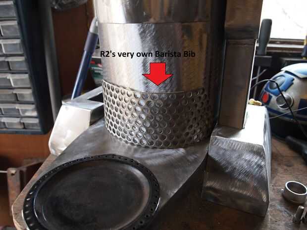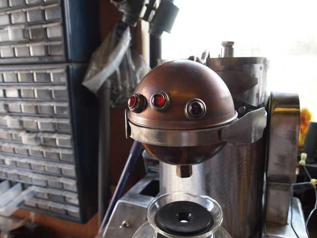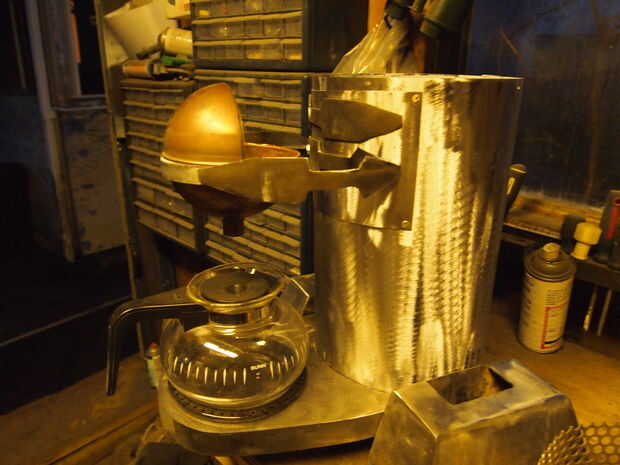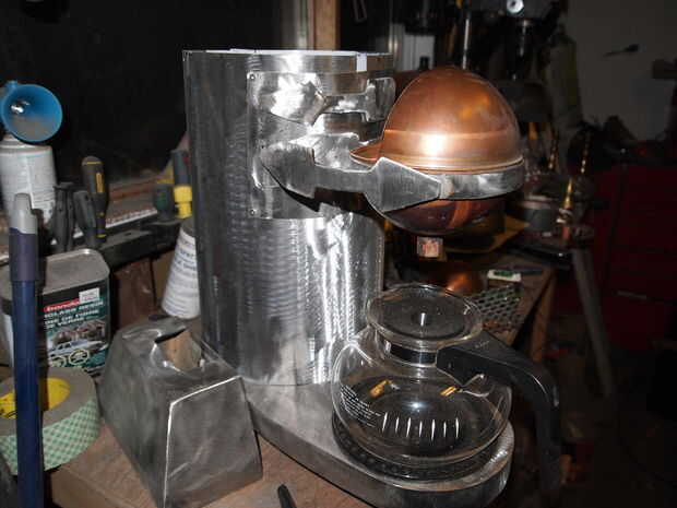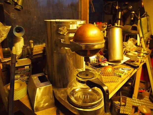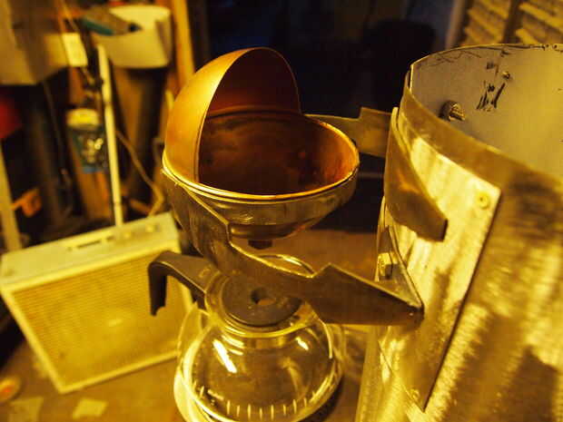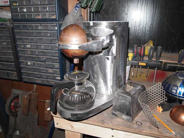 La tolva de café pasó por decenas de iteraciones de diseño. Me tarareó y girado sobre lo debe parecerse. Por un tiempo que iba a ser un droide con antenas y toneladas de detalle. Entonces no podía decidir a hacer comedia o terror mirando. Luego yo estaba jugando con la idea de lo que parece la bola de práctica de sable de luz que Luke primero se utiliza en el Halcón Milenario, pero finalmente decidió mantenerlo ultra simple, con 3 rubíes ojos rojos set bronce molido en la mano. Es casi insecto como en la naturaleza en apariencia, no realmente cuidado si se ve tan lindo o espeluznante. Construcción básica era recortar un cuarto apartado de la esfera, esto permite que el café molido y el filtro para escurrir fácilmente. Los agujeros para los 3 ojos fueron taladrados con un broca de paso y los ojos en lugar. Dentro del cobre había sido grabado para darle algún diente alrededor de los ojos y un charco de epoxy cubierto en. Supongo podría han sido soldada o incluso estén soldadas en su lugar pero el vidrio utilizado en los ojos es sensible a los niveles de calor un poco.