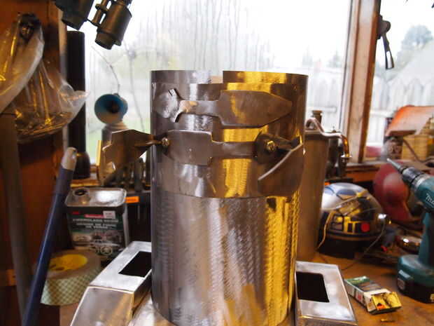 Que rodé un anillo de acero alrededor de mi tolva de café del mundo y la tachuela soldada con autógena del anillo juntos. Compruebe que todavía cabe y ligeramente tack soldadura entre las dos comillas angulares extendidas. Verifique la alineación y ajuste otra vez sosteniendo contra la unidad. Una vez que estés feliz soldarlo todo agradable y apretado. La rutina suave.