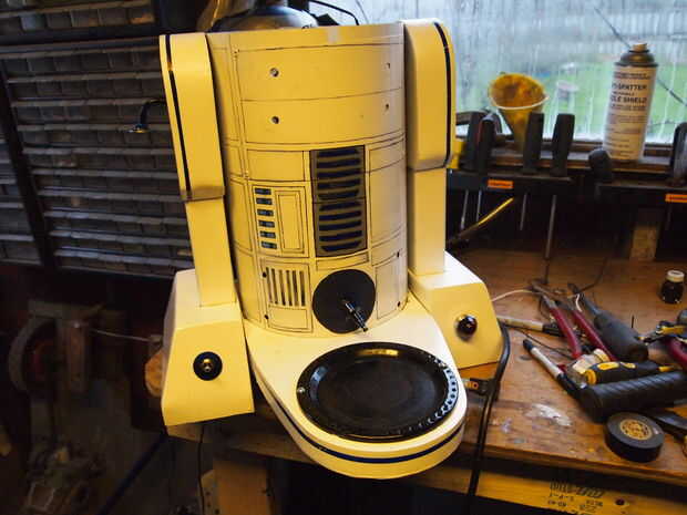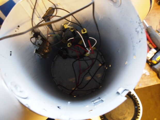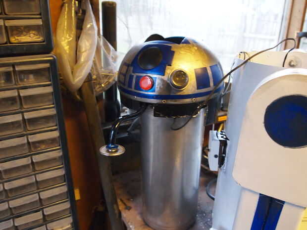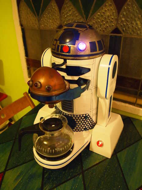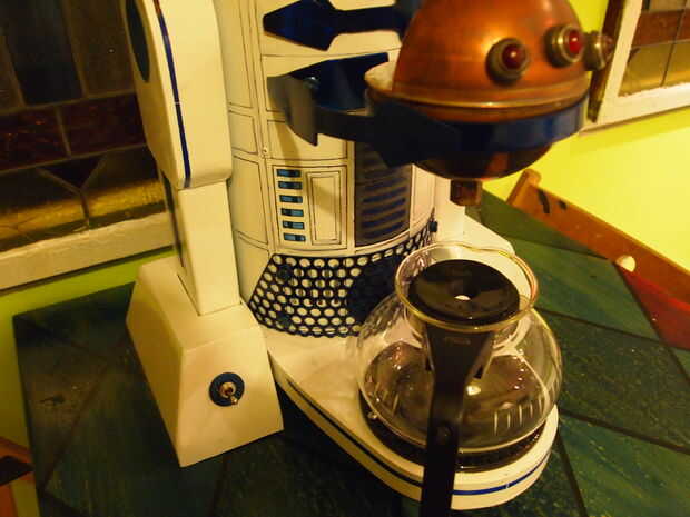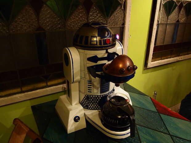 Por último el ojo LED, esto puede parecer una forma tonta de energía pero es fácil y gratis. No me molesto en usar un interruptor para él como BUNN cafeteras no utiliza un interruptor para el tanque principal o bien. Así que cuando se conecta a ellos, siempre son en. Atar el LED al tanque parecía sabio sería un recordatorio de que la unidad fue conectada todavía. Ahora el LED utiliza está diseñado para manejar 13,5 volts de corriente continua, o más bien su resistencia es clasificado para. Es realmente de 2 LEDS, uno rojo y uno azul soldado a una placa de circuito pequeñita. Encomendó de pulverizador de la arandela de protector de viento diseñado para iluminar el capó de un coche. Estoy todo sobre el reciclaje, usé lo que tenía. La cafetera por otro lado está diseñada para 120 v de corriente alterna, por lo que apenas les no podía enganchar juntos. En su lugar aproveché de grandes pies hueco de R2. Simplemente me escondí un cargador de teléfono celular pequeño que convierte la CA de 120 v en y salidas de 4v DC. A pesar de la resistencia se clasifica de 13.5v los LED ellos mismos sólo requieren de 3.5v, con la. 5V va al cielo de resistencia. Simple até la sección de enchufe de CA del transformador pequeño en poder ir a la cafetera. Cuando se conecte la cafetera, las fracturas de power para encender el LED y encienda la cafetera, desenchufe y la cafetera se apaga como lo hace el LED