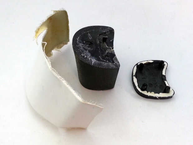 El tacón de estos zapatos se celebraron con una gran Cala industrial que mecánicamente sujeta el talón a la suela y el adhesivo. La Cala fue conectada de la parte superior de la zapata debajo de la plantilla a través de la planta del pie e incrustada en el talón de plástico. No es pequeña empresa quitar de esta cala. He trabajado durante unos 20 minutos bajar estos tacones.