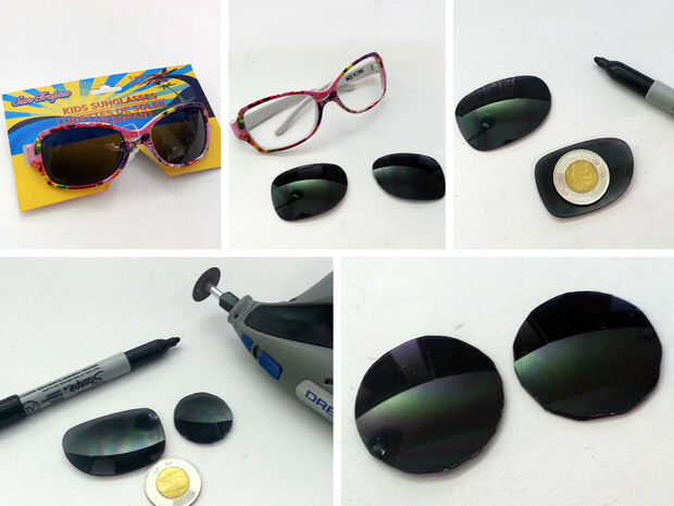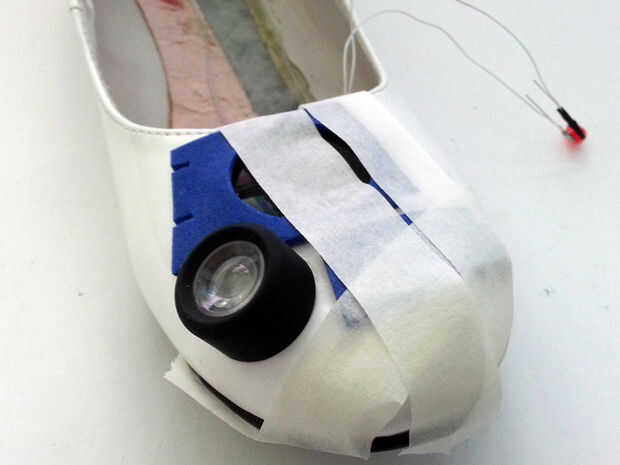 R2D2 tiene una lente grande, oscurezca. Ya que mis talones tendrá uno de estos en ambos dedos de los pies he utilizado un par barato de lentes gafas de sol. Las lentes apareció fuera del fotograma fácilmente y había trazado una forma de círculo grande con una moneda. La forma circular fue cortada con una herramienta rotativa. He utilizado un adhesivo de construcción fuerte para fijar el lente grande para el dedo del pie, el adhesivo es parcialmente elástico y permite algunos flex que evitará que la lente de estallidos cuando siendo usado.
