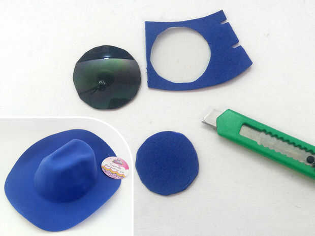 No pude encontrar las hojas de espuma en el tono azul que quería, pero sí tienen un sombrero de vaquero de espuma que era el color perfecto. Cortar el plano del borde y había trazado Acentos cabeza de R2D2, luego recortar con tijeras. Los acentos azules estaban pegados en el calzado los pies con un "pegamento de espuma" que encontré en la tienda de artesanía. Este pegamento ve como pegamento blanco, pero menos viscus y derrite la espuma un poco para crear el vínculo. Este pegamento demasiado acerca de un día para curar totalmente, por lo que se utilizó cinta adhesiva para fijar la espuma.