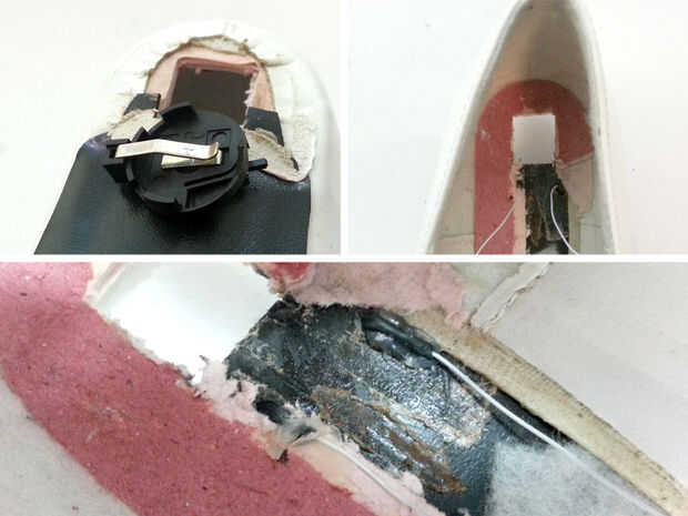 Después de han instalado los elementos el cableado sobrante puede ser encolar utilizando pequeños toques de pegamento caliente. También decidí añadir un pequeño trozo de tela suave en el interior de la puntera para cubrir el cableado y proteger los pies de alguno expuesto cableado roce.