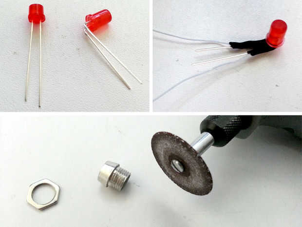 Elegí para aplanar la parte superior de mi 5mm LED rojo que sentó al ras cuando se insertan en el soporte de LED. Usando una herramienta giratoria las copas de los LED se afeitan hasta aproximadamente 2/3 su altura original. Las patas del LED fueron dobladas a 90 grados y conectadas al circuito.