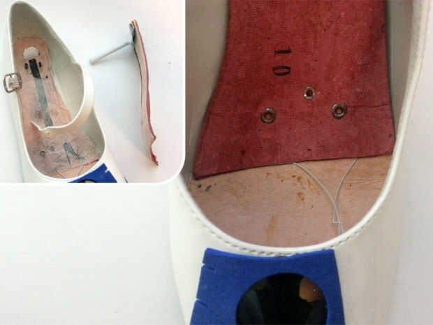 Con cemento de goma resistente las plantillas talón pintados estaban pegadas en la forma de zapato. Ellos se sujetaron en el lugar y se dejó curar durante la noche. Estas plantillas perfectamente cubren el cableado instalado.