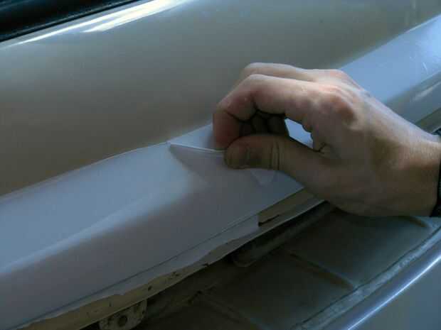 Después de hacerlo, trabajar el exceso alrededor de los bordes y la parte posterior de los paneles de metal para dar un mejor anclaje. Es buena idea poner más calor en las partes invisibles y presionar duro con la escobilla de goma para impedir la elevación de los bordes.