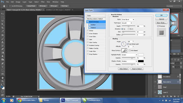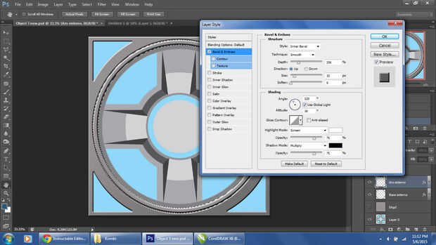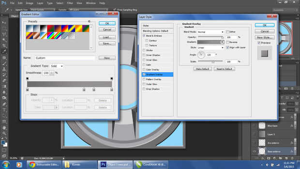 Para cada nueva capa, trabajar con estilos de capa para definir la "superposición de degradado" y "bisel y relieve". Las imágenes muestran un par de ejemplos.