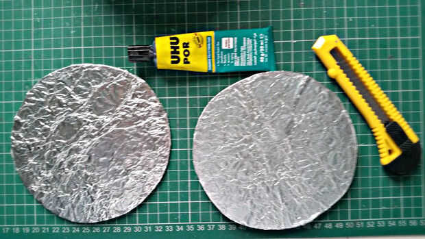 Utilizando un tablero de la espuma de 3mm, cortar un círculo del mismo diámetro de la parte superior de la cúpula y otra 3 / 4cm más grande.