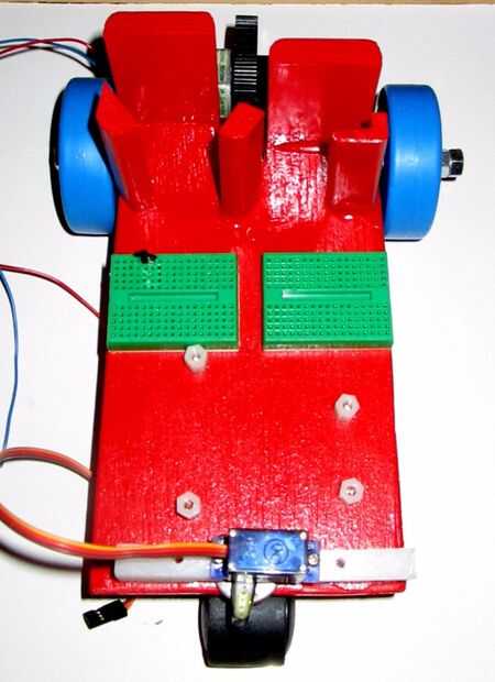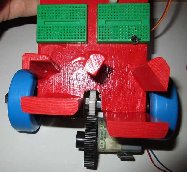 Sobre la plataforma de madera cerca del frente son varios posts de nylon que se utilizará para conectar el Arduino Uno R3 que es el cerebro del robot. Detrás de eso hay un par de mini verdes-breadboards que até para experimentar con los accesorios para el robot. Usted puede notar un área ennegrecido en una de ellas donde uno de mis experimentos fueron mal y comenzó a fundir la placa. Fue una experiencia de aprendizaje!