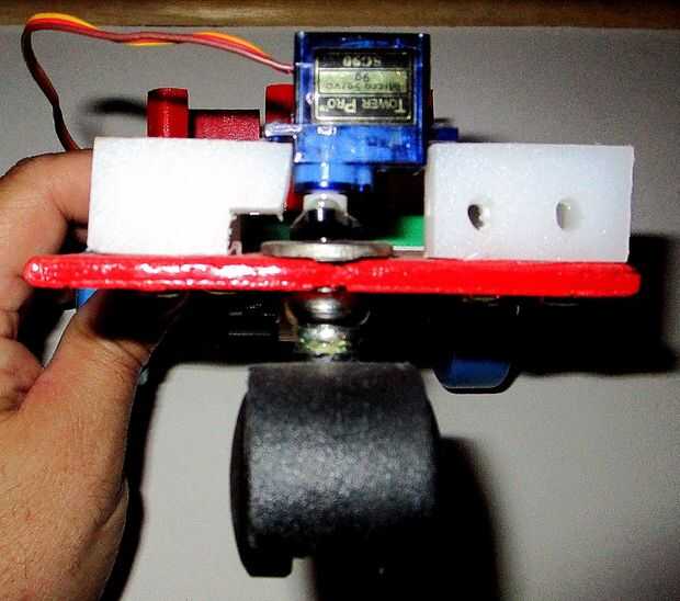 El cuerpo está compuesto de una 1/4" madera contrachapada plataforma de 4" x 7". Hay una serie de mensajes pegados en la parte posterior que forman recintos para mantener las baterías. En el frente son dos bloques blancos de polietileno de alta densidad de una vieja tabla de cortar. Un servo se une a aquellos con un par de tornillos. El mecanismo de dirección para el robot consta de una sola rueda que tenía puesta alrededor. El eje de la rueda pasa por un agujero en el frente de la plataforma con las arandelas superiores e inferiores. Tuve un solo servo armado del cuerno que se ajustan encima de la rueda, que ajustaron a otro cuerno del servo solo brazo en el eje del servo motor. Los bloques blancos fueron tamaño para caber para que el servo fue a la altura adecuada para este lanzador particular. Cuando el servo gira, gira la rueda y dirige el robot.