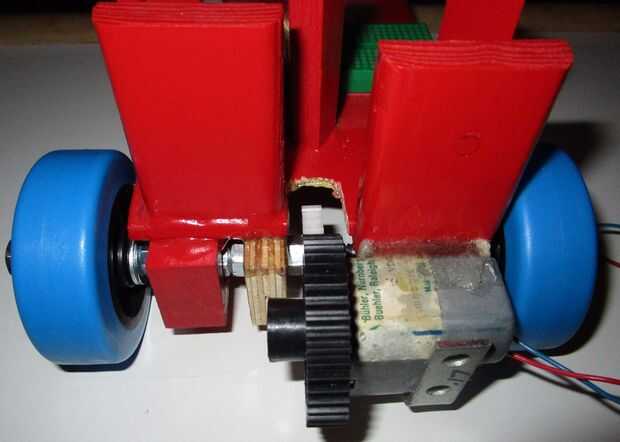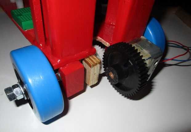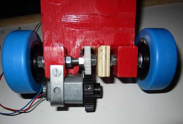 El tren de la impulsión consiste en un motor de engranaje de Buehler de 12v que se adjunta a la parte trasera del robot utilizando un soporte en L. Os adjunto el soporte en L al cuerpo del robot para que el motor se deslizó firmemente entre el cuerpo y hacia arriba el frente brazo del soporte. A continuación os pongo algunos epoxi a lo largo de la costura donde el motor había tocado el cuerpo, y que lo mantiene firmemente en su lugar. Hay un gran engranaje en el eje del motor que las mallas con un engranaje más pequeño en el eje de la rueda para que cuando el motor gira, conduce la rueda. Hay varios bloques de madera atados al cuerpo que el eje pasa por darle estabilidad y mantener en su lugar.