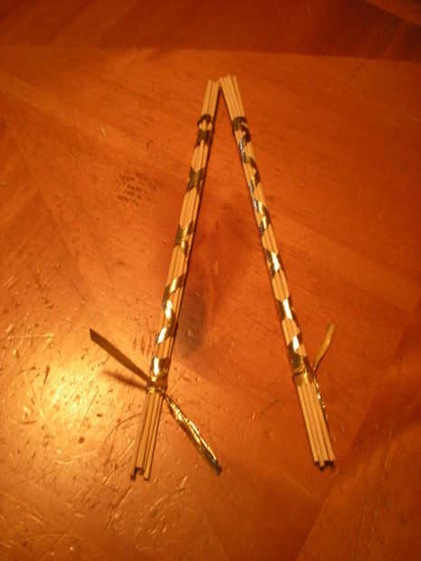 de la cinta de 22 pulgadas, por el centro hacer un nudo en un extremo de los palitos agrupados, despegar la cinta de goma, alrededor de longitud de los sticks y hacer otro nudo en el otro extremo. Hacer otro.