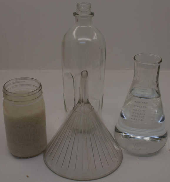 - Con el embudo, vierta el vodka y el rábano picante 'puré' en la original botella de vodka. Utilizar el vodka del paso #3 para lavar el tarro de masón y lavar la pulpa a través del embudo.