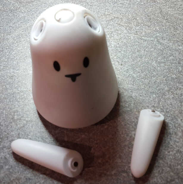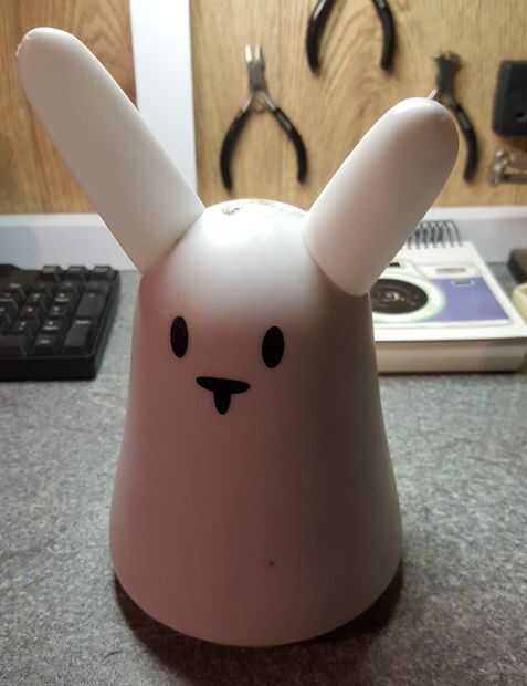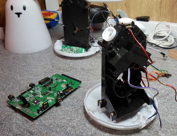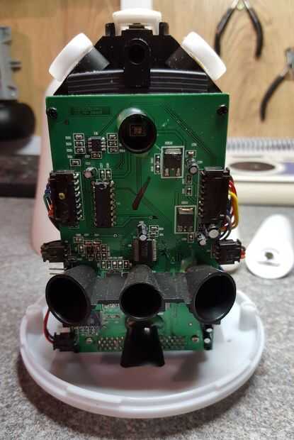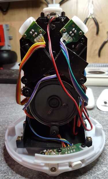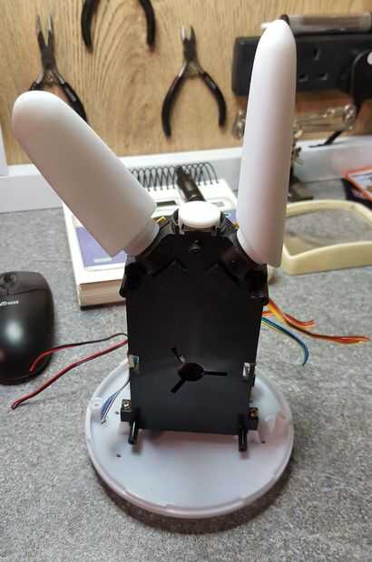 El primer trabajo fue desmantelar el Nabaztag y ver qué partes podrían ser reutilizados. Las orejas están diseñadas para ser intercambiables y sólo llevó a cabo con imanes, así que fue fácil, y la cubierta principal se llevó a cabo sólo dos (extraño triangular) tornillos. Esto expone todos los circuitos y componentes, en torno a un pilar central de plástico. Un lado llevó a cabo el circuito principal y LEDs, con un altavoz en el otro lado y motores/botón incrustado en el pilar en la parte superior.