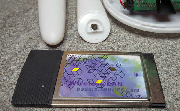 Como yo sólo planeaba mantener los motores que había cortado a través la mayor parte de los cables y empecé sacando los tornillos. En este momento tengo una verdadera sorpresa! Detrás "" cerebro del conejo circuito era una ranura corriendo toda la altura del pilar, que contenía una tarjeta de wi-fi PCMCIA tamaño completa, el tipo que se usaría en portátiles antiguos. Supongo que fue un compromiso de diseño o compatibilidad en el tiempo, pero comparándolo en tamaño a un dongle USB moderno realmente llevado a su casa cuánto la tecnología ha reducido en el espacio de 10 años.