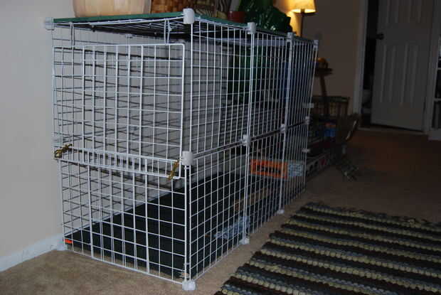 Vas a maneras de acceder a la jaula del mismo y formas de bloquear apagado su mascota entren tan fácilmente se puede captura veterinario visitas etc.... Lo que hice fue crear dos puertas usando los broches de resorte. Usando el lado de la caja existente, había suspendido desde la parte superior de la frente a través de los broches y luego zip lo ató a la jaula. Esta manera, puedo deshacer los cierres, permitiendo que el swing hacia abajo y reformar la jaula original, luego volver a cierre lo. Del mismo modo, lo hice con un panel hecho de paneles de cubo en la mitad superior de la espalda.