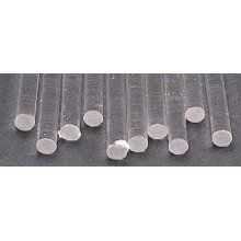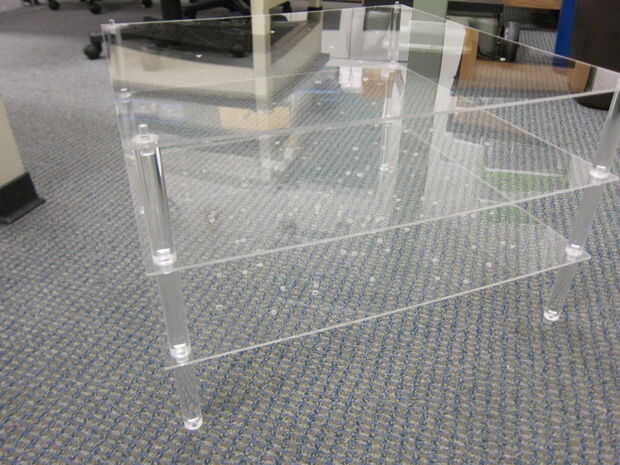 El siguiente paso es cortar las barras de acrílico que se apoyan las capas. Utilizar varilla de 3/4" de diámetro y cortar en tiras de cuatro pulgadas. Hice el corte inicial con la Sierra de cinta y luego utiliza el torno para cortar al tamaño exacto. La varilla de 3/4" se encuentra entre cada capa, sosteniendo hacia arriba. Pero para mantenerlo todo junto, he utilizado 1/4 barra de plástico como tornillos. Usted podría utilizar tornillos convencionales, o cualquier número de otros métodos para unir las capas, pero quería la cosa entera a claro.