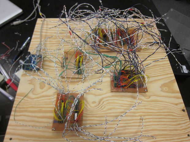 Una vez que todos los LEDs han sido cableados, usted querrá cada conjunto de ocho de alambre juntos. Alambré todas las salidas de entrada común juntas y todas las entradas A, entradas B y C entradas fueron cableados juntos así. Hice un pequeño escudo para arduino, por lo que podría asegurar las conexiones. Por desgracia, los 80 LEDs dibujan mucho más corriente que puede fuente de Arduino. Le puse un transistor entre arduino y cuatro entradas, con 5v en el colector, el arduino en la base y una resistencia de 1 k va a tierra en el emisor, para crear un circuito seguidor de emisor. Asegúrese de conectar la tierra de la fuente de energía y la tierra del arduino con el emisor, ya que arduino necesita conocer sobre el terreno de fuente de energía del circuito a trabajar.