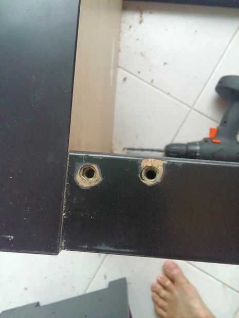 Taladre los orificios de la placa de componentes, tamaño voluntad depand en las tuercas del parte movible que se utiliza. Recomiendo usar una broca de acero no una madera uno que le dará una mejor estabilidad y precisión en el material muy endeble de la tabla de ausencia (en la foto que se puede ver que un agujero no está alineado, tengo que perforar otra vez al otro lado de la mesa). Atornille las tuercas PLT Inserte pero tenga cuidado, el material de pierna de la tabla es de 3mm o 4mm de espesor. Tienes la superficie y pintar los orificios (yo usé una pluma permanente de negro)