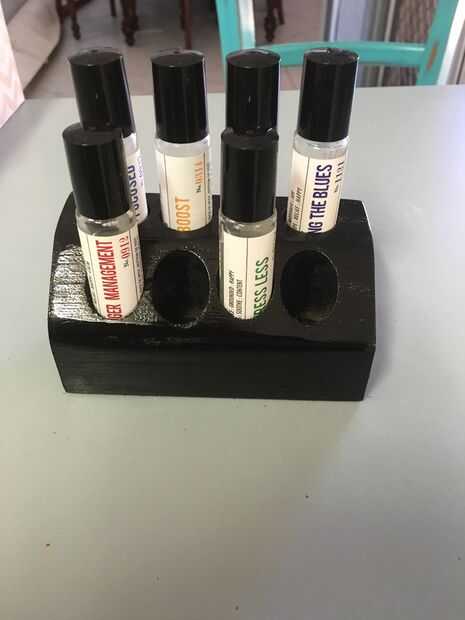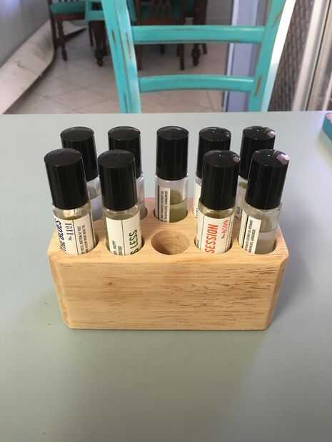 mi pareja utiliza aceites esenciales y hace sus propias mezclas. Las botellas de 20mm que usa cualquiera de sus estantes no encajan así que hice una de una vieja pata de la mesa. Ahora, esta es mi tercera.