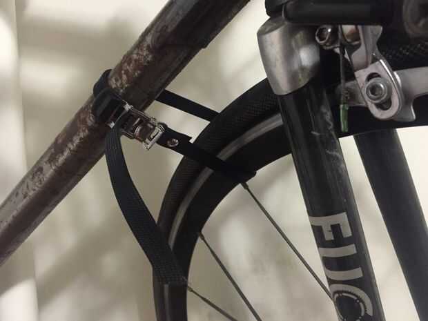* Bonus * si usted tiene algunas correas de clip de puntera de repuesto utilice para atar rápidamente su rueda delantera al tubo para no mover sus ruedas o vuelta abajo mientras están en el estante. Sugiero apoyar tu tienda de bicicletas local, pero si es necesario el internet, usted puede muy bien algunas baratas aquí.