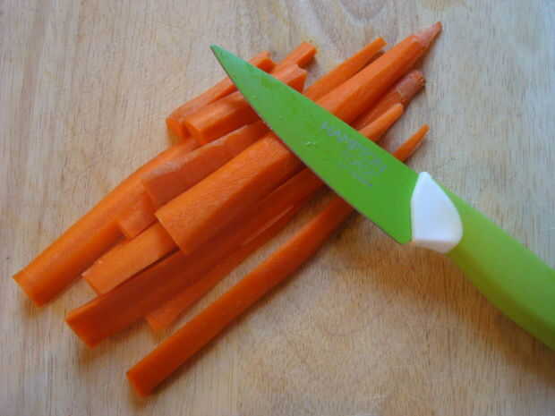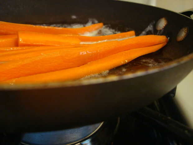 I en rodajas y cocida la calabaza y las zanahorias en una sartén con mantequilla, añadir un poco de color. No necesita tanto como se verá en las fotos más adelante.