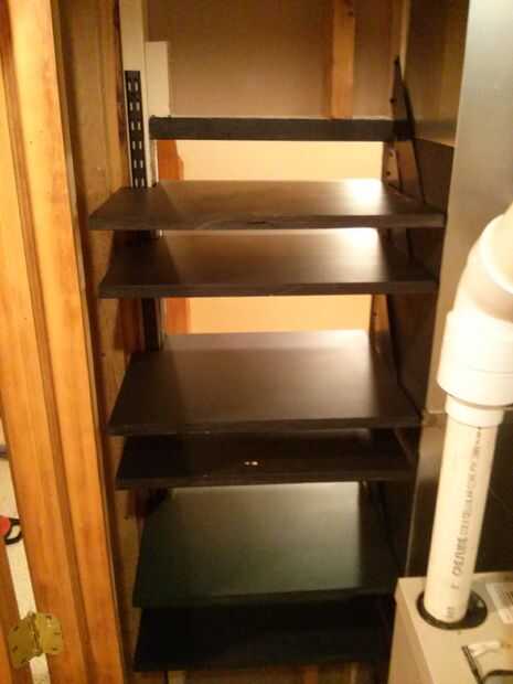 En las últimas fotos aquí puedes ver que las estanterías tienen una muesca que recortar a la izquierda para que el apoyo de pista puede coger del estante. La derecha tuvo que cortarse recto porque el soporte del estante más bajo se envuelve alrededor de la plataforma