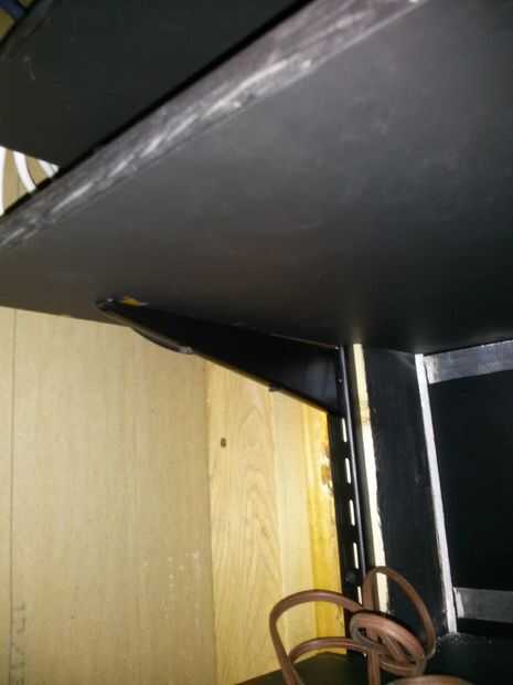 como el ilustrado en la ferretería. Era capaz de atornillar en el lado izquierdo pero el lado derecho del orificio quede al ras con el horno y no tengo suficiente espacio para la pista. Después de mucho pensar he recogido lo que se denomina un "más bajo de soporte del estante". Tienen curvas de 90 grados en ambos extremos pero tuve que acoplar uno de ellos hacia fuera. Jodido entonces lo aplane en el interior estructura del agujero. Luego enrosca el otro extremo en la parte inferior de los estantes. El lado izquierdo de los estantes era compatibles con los soportes de estante simple de doble pista y atornillado a la parte inferior de los estantes.