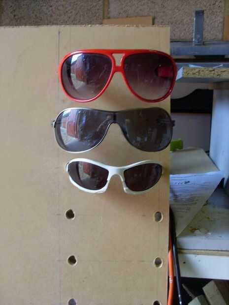 Espaciados los orificios verticalmente basados en el par más grande de gafas de sol, de esta manera, usted puede poner un par en cualquier espacio sin ningún conseguir hacinados hasta. Una vez asegurado el concepto inicial trabajado, podría luego corté la Junta. Una vez más, siempre más fácil haya perforado los agujeros etc. en una pieza grande de madera que uno más pequeño.