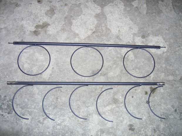 sabía que esto tenía el potencial para convertirse en un rack de guitarra. Las dimensiones y espaciamiento salió más fácil de lo que esperaba. Simplemente corté a la mitad de tres lazos en una barra y después soldado con autógena la otra mitad entre los otros.