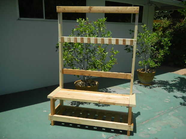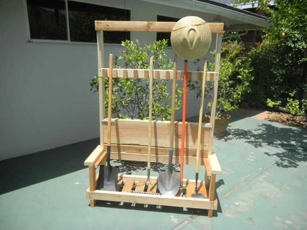 Se trata de un estante de la herramienta de jardín pero también es un asiento o Banco de trabajo de colocar un tablero capaz de doblar. Ofrece una manera fácil de mantener herramientas de jardín. No necesita voltear sobre herramientas, sin necesidad de ganchos, tan fáciles como una pala se apoye sobre una esquina de una pared, poner una herramienta en el estante, bloques de madera en el riel superior llevará a cabo el mango de la herramienta como esa esquina de la pared.