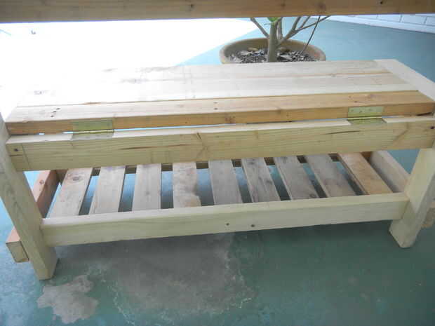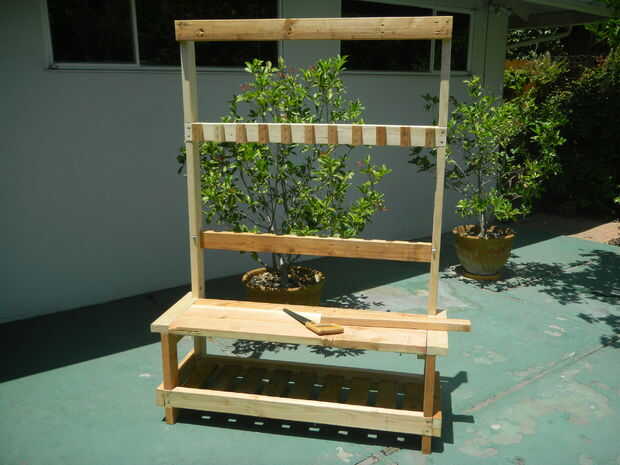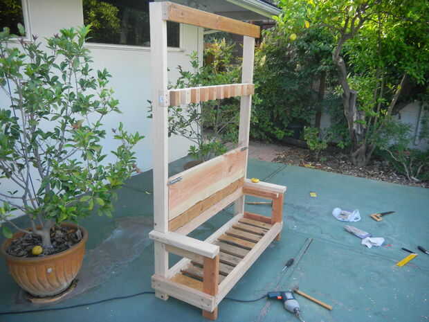 A continuación fijar el de últimos 3'9 "longitud de la viga de madera de 2 x 4 en la parte posterior de la Junta de banco como imagen. Deja el Consejo del Banco para ir a la espalda.