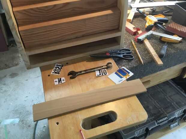 He utilizado. Router para hacer un bolsillo ahuecado para recibir una bisagra de piano de 12". Hice lo mismo en la parte posterior de la tapa 2 x 4. Utilicé tornillos de barril para fijar la bisagra a los tornillos de madera y tablero en 2 x 4. Salieron grandes. Todo lo que tiene que hacer ahora es elevación de la canasta para guardar su martillo y lo que no...