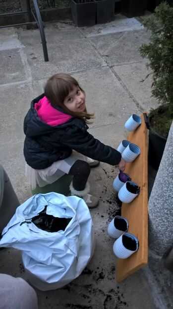 El siguiente paso es llenar las macetas con tierra, siembra y riego. Supongo que este paso no necesita mucha explicación. Sólo llene las macetas con tierra de 1,5 cm debajo del borde, en las semillas y añadir otro 0,5 cm de tierra. Como se puede ver en la foto tenía algo de ayuda:). Al final dan algo de agua.