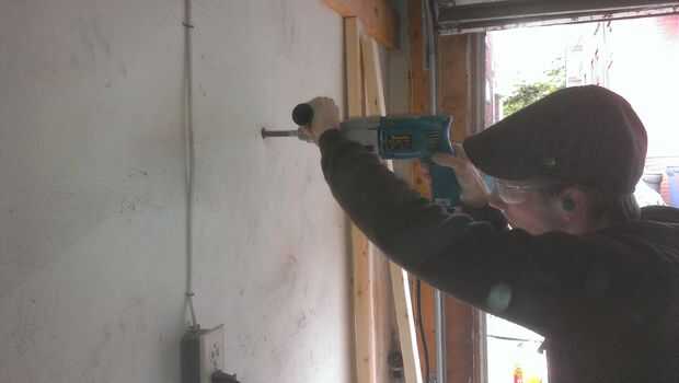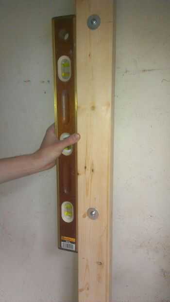 Perfore orificios de 1/4" el 2x4s sobre la parte plana. Montar los pernos de anclaje en la 2 x 4. Coloque los pernos acodados en los agujeros en la pared del garaje y apriete con una toma de corriente. Asegúrese de que el 2x4s nivel.