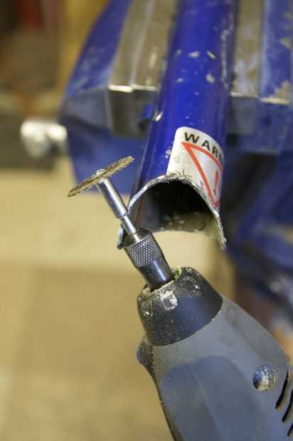 a continuación, usted quiere algo para sujetar el marco a. Por lo tanto, tome un pedazo de tubo y cortar un semicírculo en él. Usé un dremal, que no es la forma más fácil de hacerlo, pero funciona. Soldadura vertical post, y prueba de ajustar el monociclo a él con una cuerda del amortiguador auxiliar.