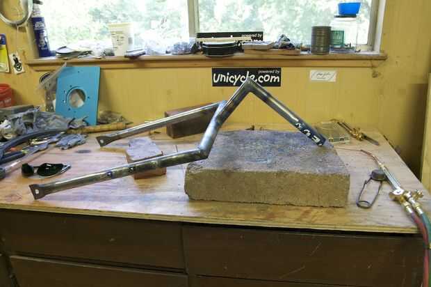 a continuación, usted necesita encontrar el buen lugar para colocar un poste horizontal. Para que funcione con 20" y un 24" uni, tenía el post justo encima de la llanta de 20" y justo por debajo del borde de 24" (pasar a través de los radios - ver la última foto). Cuando haya encontrado el punto dulce, cortar los dos postes para colocar en ángulos de 45 grados y soldarlas juntas. Tuve los ángulos con el tubo horizontal apuntando ligeramente hacia arriba para mantenerla juntos un poco más.