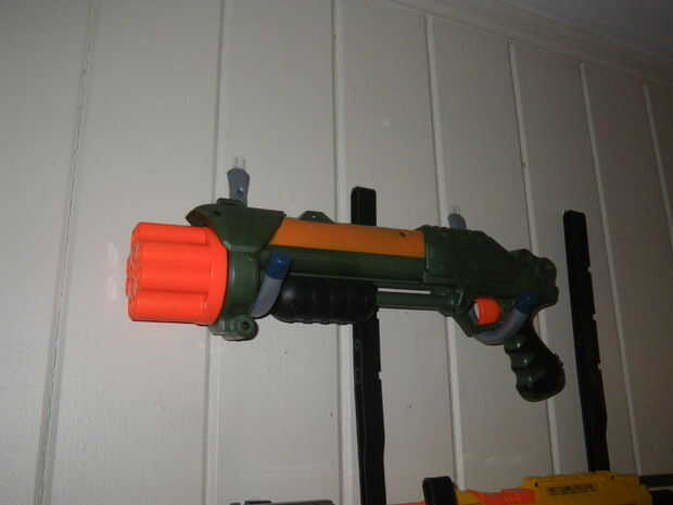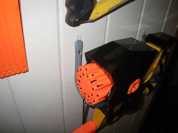 Asegúrese de que los blasters son nivel cuando descansan en los ganchos. Mi sugerencia es poner el gancho delantero primero, luego utilice la pistola para colocar el segundo.