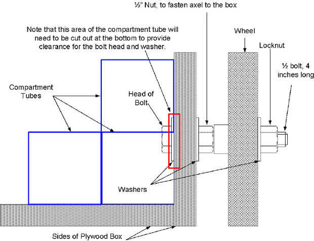 El fondo de la caja debe sentarse sobre el suelo un poco para dar espacio, para que no raspe por el suelo cuando se mueve. Elegí que se sientan ¾" de la tierra y también los agujeros para los ejes perforados 2 ¼" sobre el borde inferior de la caja. Utilicé las arandelas grandes donde el perno y la tuerca de ajuste hacia abajo en los lados de la caja, para distribuir la presión. Las ruedas se colocan en los ejes, y luego están roscadas tuercas con inserciones de nylon, para evitar que las ruedas siempre trabajando la tuerca floja. Consulte el diagrama para el montaje de axel.