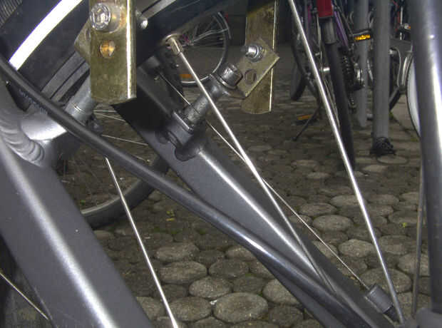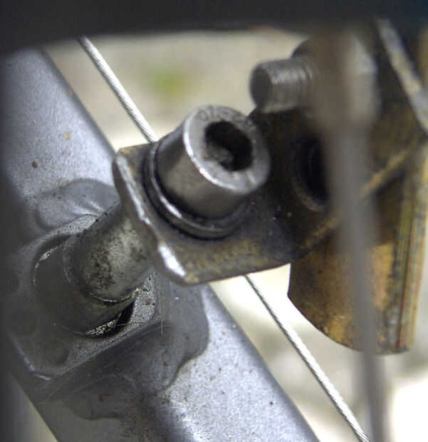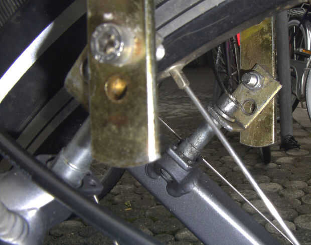 Sería posible fijar la escuadra a la estructura directamente atornillando una especie de gran tornillo en el agujero de poste del freno, así evitando la necesidad de compra de pasadores de freno y probablemente aumentar la estabilidad. Eventualmente pueden llevar abajo al final donde se une el soporte angular, sin embargo (tal vez agregue una capa de caucho de un tubo interno entre acabado y soporte?).
