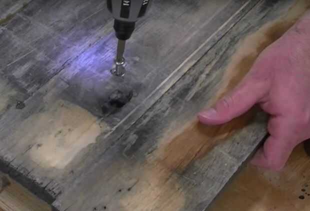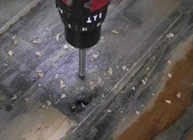 Voltee el panel y un agujero con una broca forstner para permitir que el perno y la arandela para sentarse justo debajo de la superficie de la espalda baja.