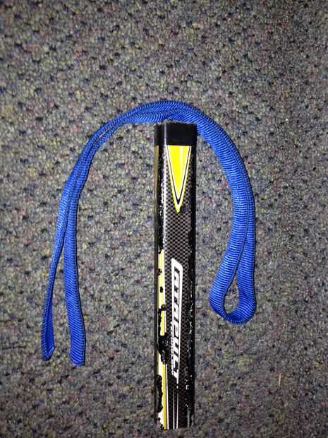 Asegúrese de que la longitud de las correas es suficiente para lazo alrededor de los travesaños y a través de la porción hueca del palillo del hockey con espacio sobrado para garantizar una porción significativa en el exterior del palillo del hockey.