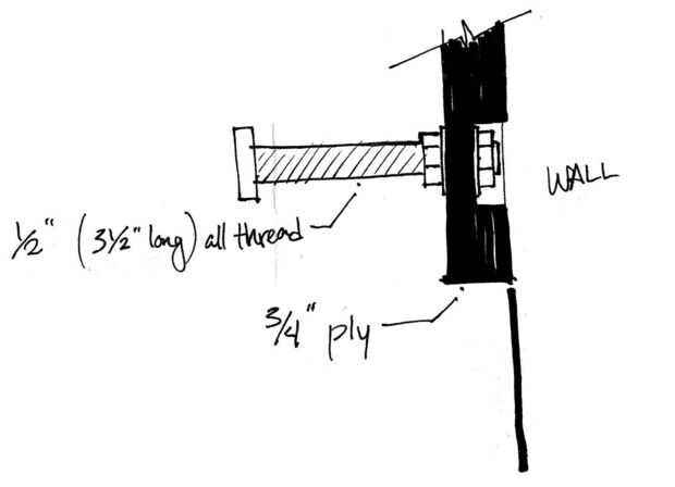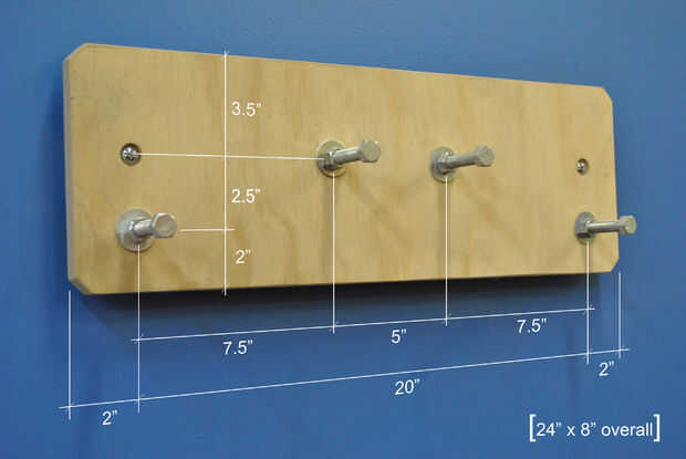 Cuatro tornillo perforar con el taladro (un taladro de mano no se recomienda como va a ser difícil para ganchos perpendiculares – y no quiere cosas deslizamiento!). Puesto que los tornillos requieren tuercas en la parte trasera, la segunda pieza de madera contrachapada traerá la placa de la pared. Utilice una broca de paleta para avellanar la parte trasera y proporcionar la separación necesaria.