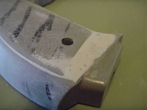 Compruebe las indicaciones del fabricante para tiempos de secado, pero 15-30 min es suficiente para 2 parte compuestos como éste que he utilizado. Para lugares planos utilice un cuchillo plano, cincel o arte para eliminar el exceso. Coloque la cuchilla plana contra la superficie y no arañar en el compuesto, solo afeitarse de la parte superior capa más. Paciencia en esta etapa le dará una superficie relativamente plana que puede traer aún más con el lijado. 100 es un buen grano mediano que hace el trabajo rápido sin dejar a muchos rasguños.