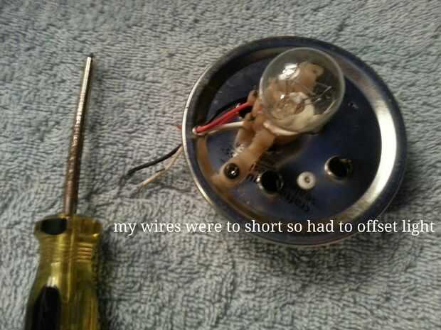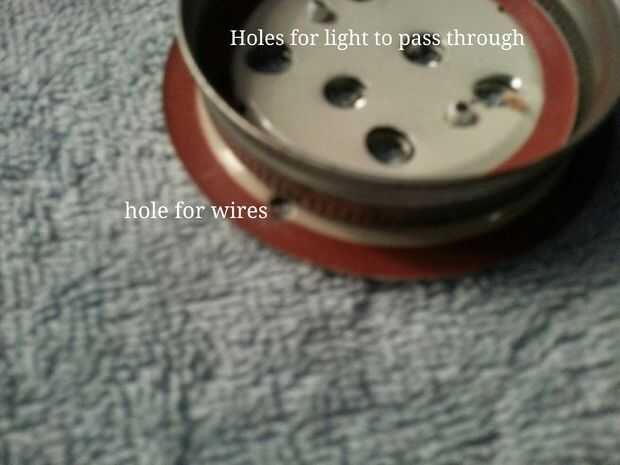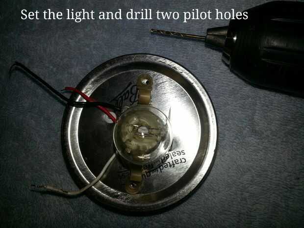 Poner la luz encima de la tapa y taladre dos orificios piloto. Voltee y múltiples orificios para que la luz pase a través. Taladre un agujero para alimentar alambres de la bombilla a través. Tornillo de abajo de la luz y los cables de alimentación a través del orificio.