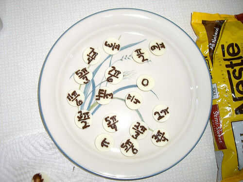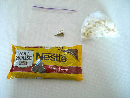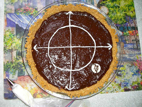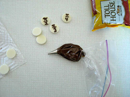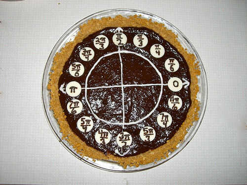 Este es un muy divertido paso que requiere de algunos utensilios de cocina comunes. Necesita mejores bolsas de sándwich tamaño zip (o bolsas de repostería) y una punta de tubería con una punta fina en él (yo usé wilton #3). Para decorar utilicé chocolate blanco y negro, discos de fusión. Los discos de blanco y chocolate con leche pueden comprarse en cualquier tienda de artesanía (de Miguel, Joannes, etc.). Derretir algunos de los discos de chocolate blancos y oscuros y relleno en una manga pastelera (hacer tu propio con la cremallera bolso superior). Las diversas medidas de radián en los discos de chocolate blanco unmelted, dejar endurecer en la nevera para endurecer la pipa. Con chocolate blanco, tubo del eje de coordenadas en el pie, asegurándose de etiquetar los ejes x e y. Para el tubo de centro fuera un chocolate disco con el símbolo para Pi y deje que se encuentra en el refrigerador antes de colocar sobre la tarta.